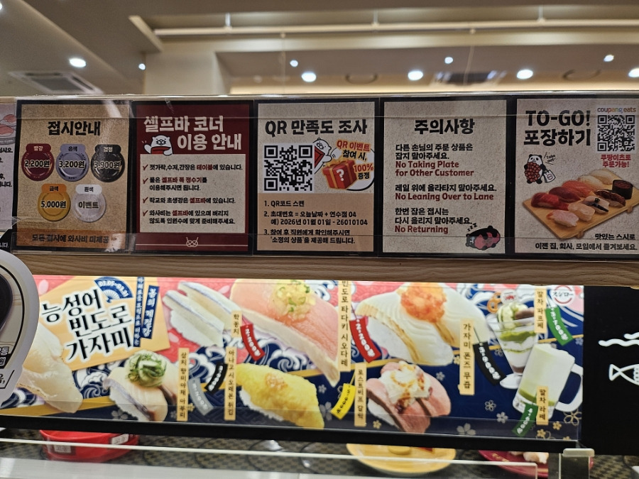스시로는 “가볍게 즐기는 초밥집”에 가깝습니다. 고급스러운 식사보다는 빠르고 편하게 초밥을 먹고 싶을 때 잘 맞습니다.